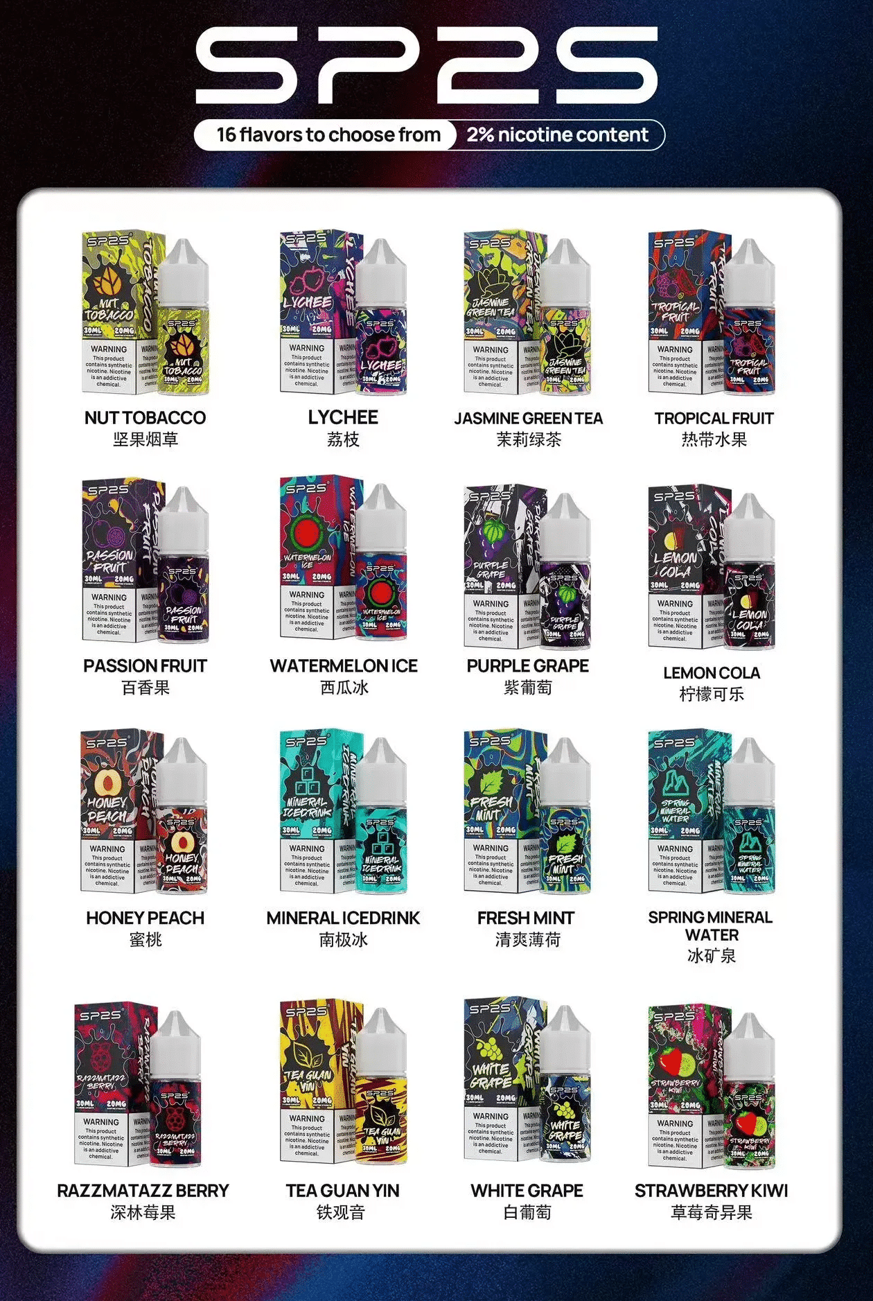 SP2S 思博瑞煙油,專為可注油煙彈而設計,30ML 大容量,20MG 尼古丁濃度,提供16種豐富口味選擇,滿足您對小煙煙油的多樣需求。